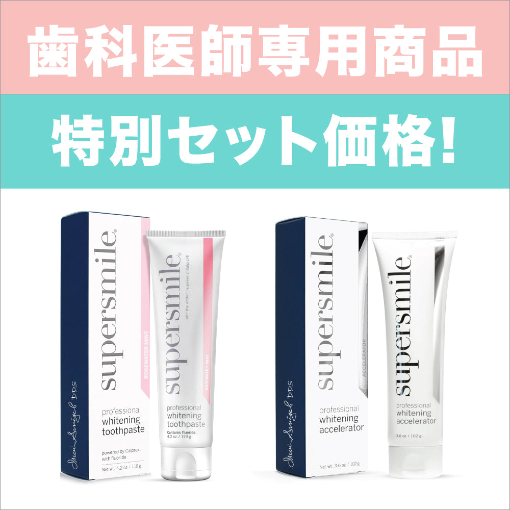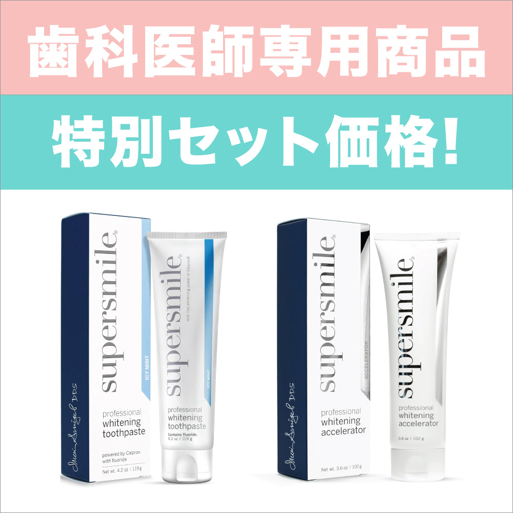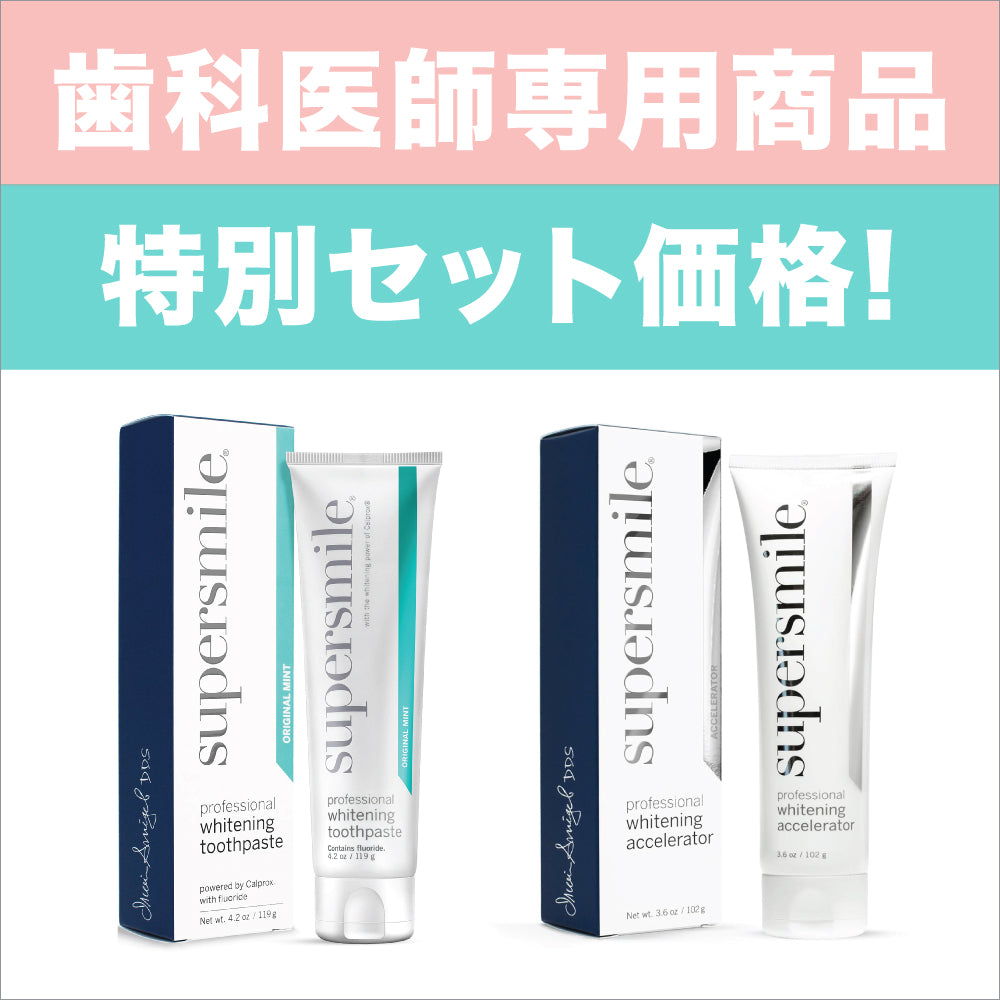 スーパースマイル独自成分の「カルプロックス」を含んだ今話題の歯磨き粉とホワイトニングの作用を活性化させるアクセラレーター歯磨き粉。通常の歯磨き粉とアクセラレーターを同時に使用することによって、より早く白さを実感できます。